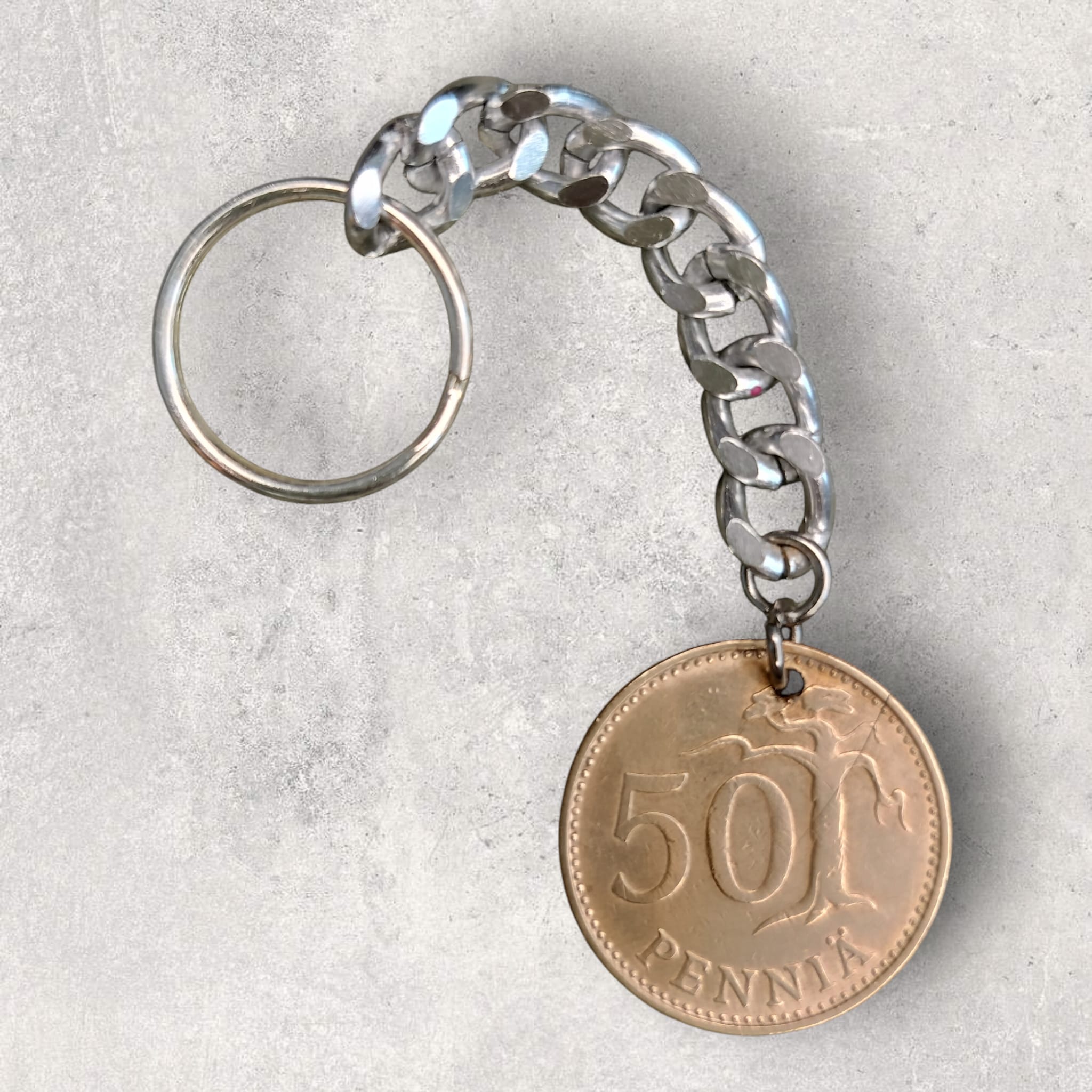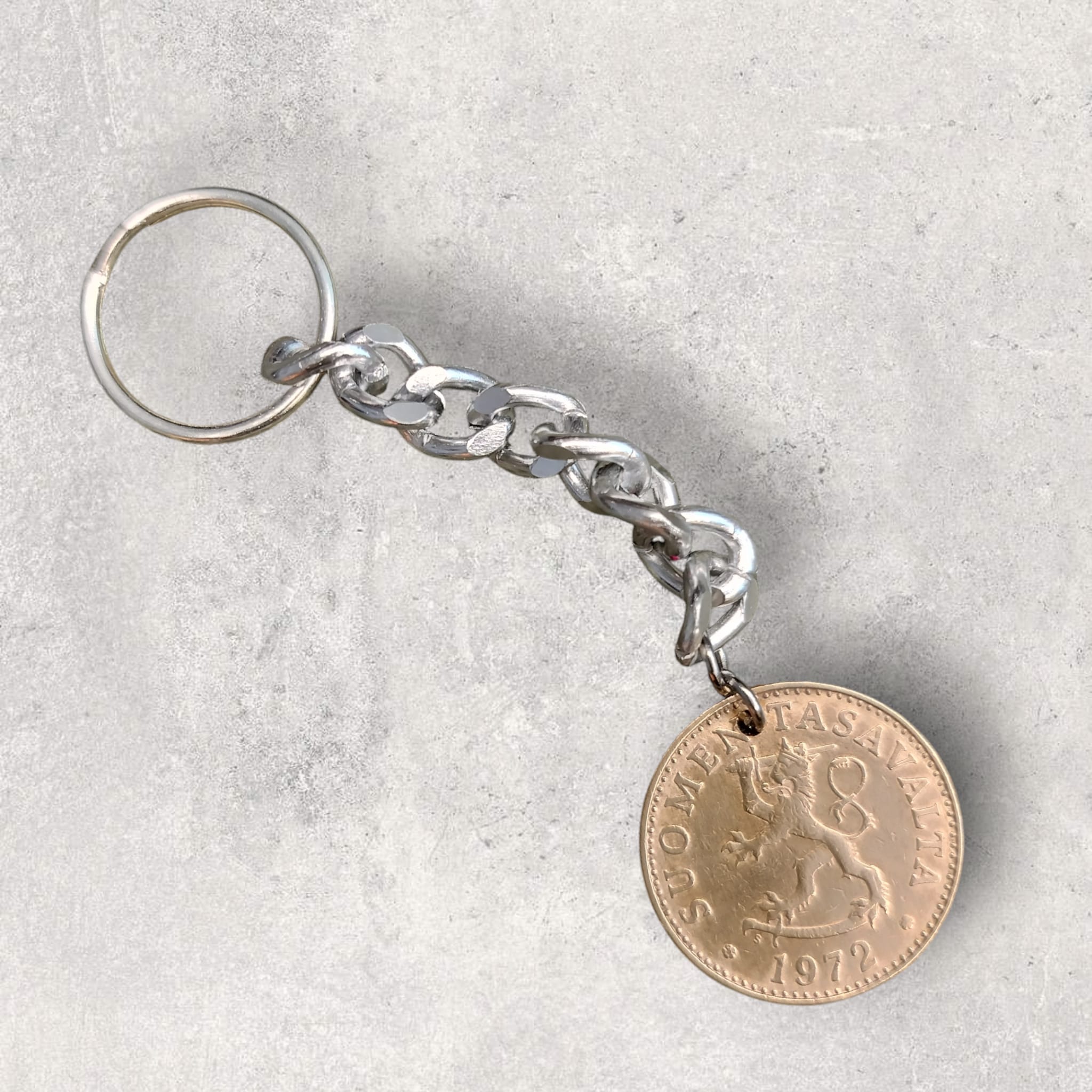 Ketju alumiinia, pituus 5 cm. Avainrenkaan läpimitta vaihtelee. Kolikon läpimitta n. 2,5 cm.