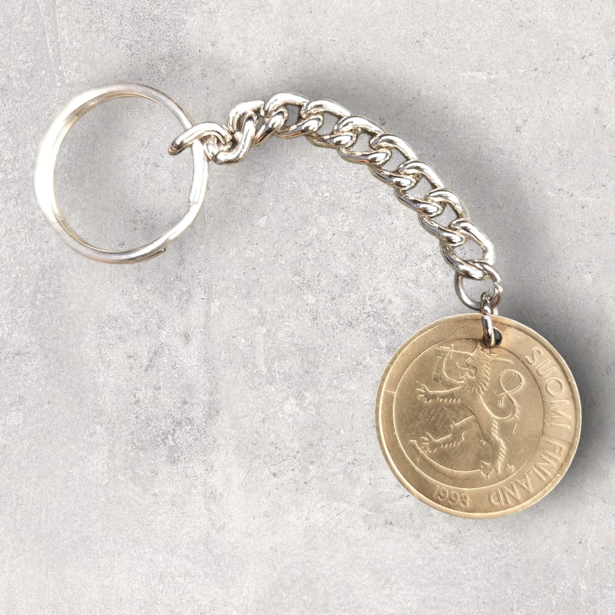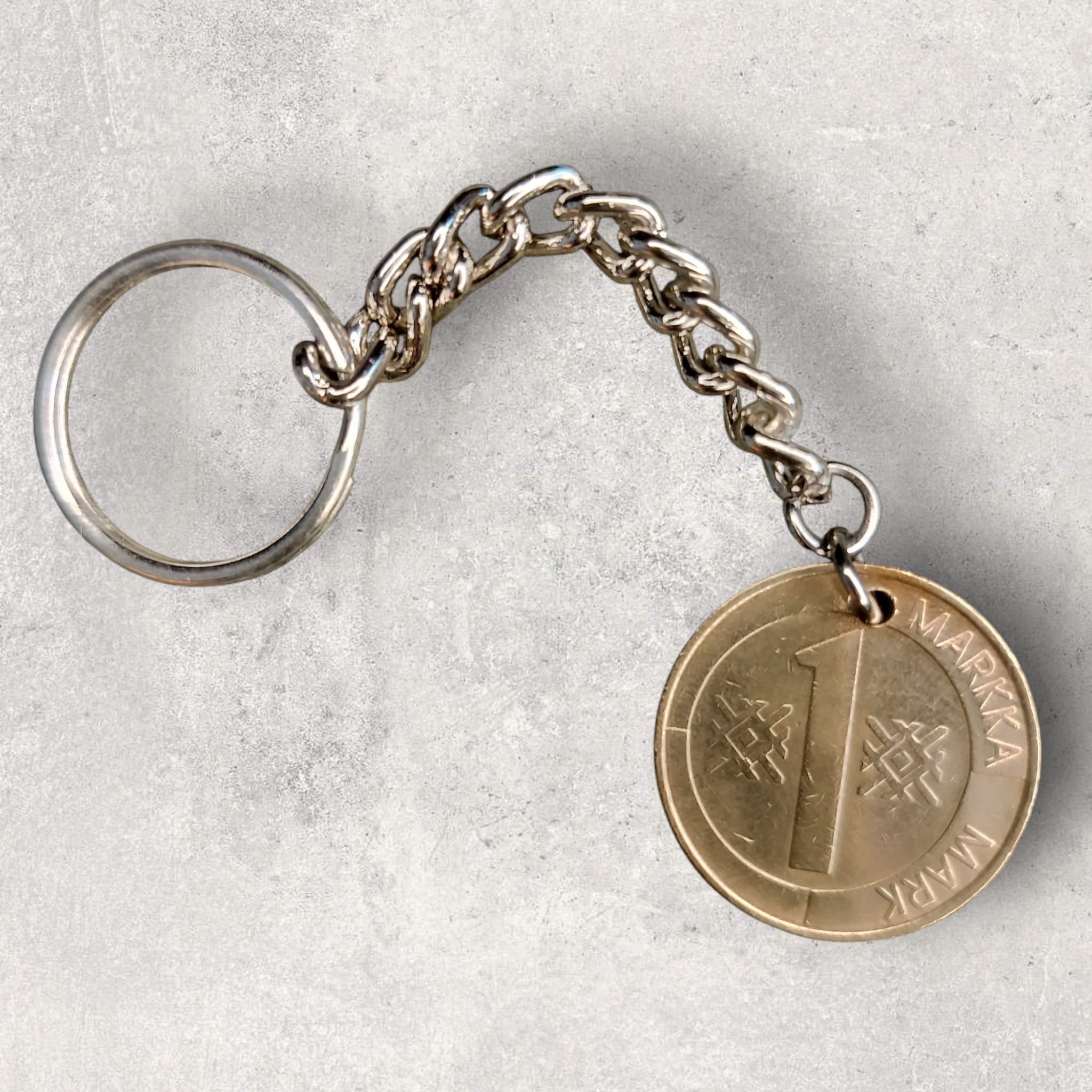 Ketju alumiinia, pituus 5 cm. Avainrenkaan läpimitta 2 cm. Kolikon läpimitta n. 2,2 cm.