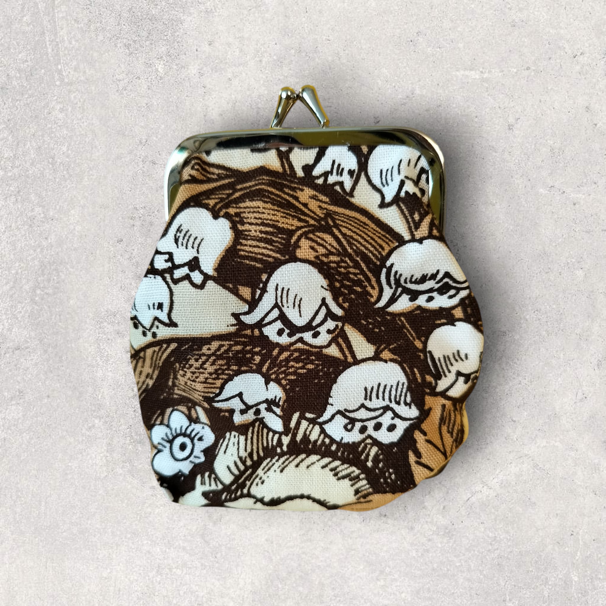 Nipsukukkaro puuvilla vuorella. Kierrätyskankaat, korkeus noin 14 cm, leveys noin 10 cm, pohjan syvyys noin 4 cm.