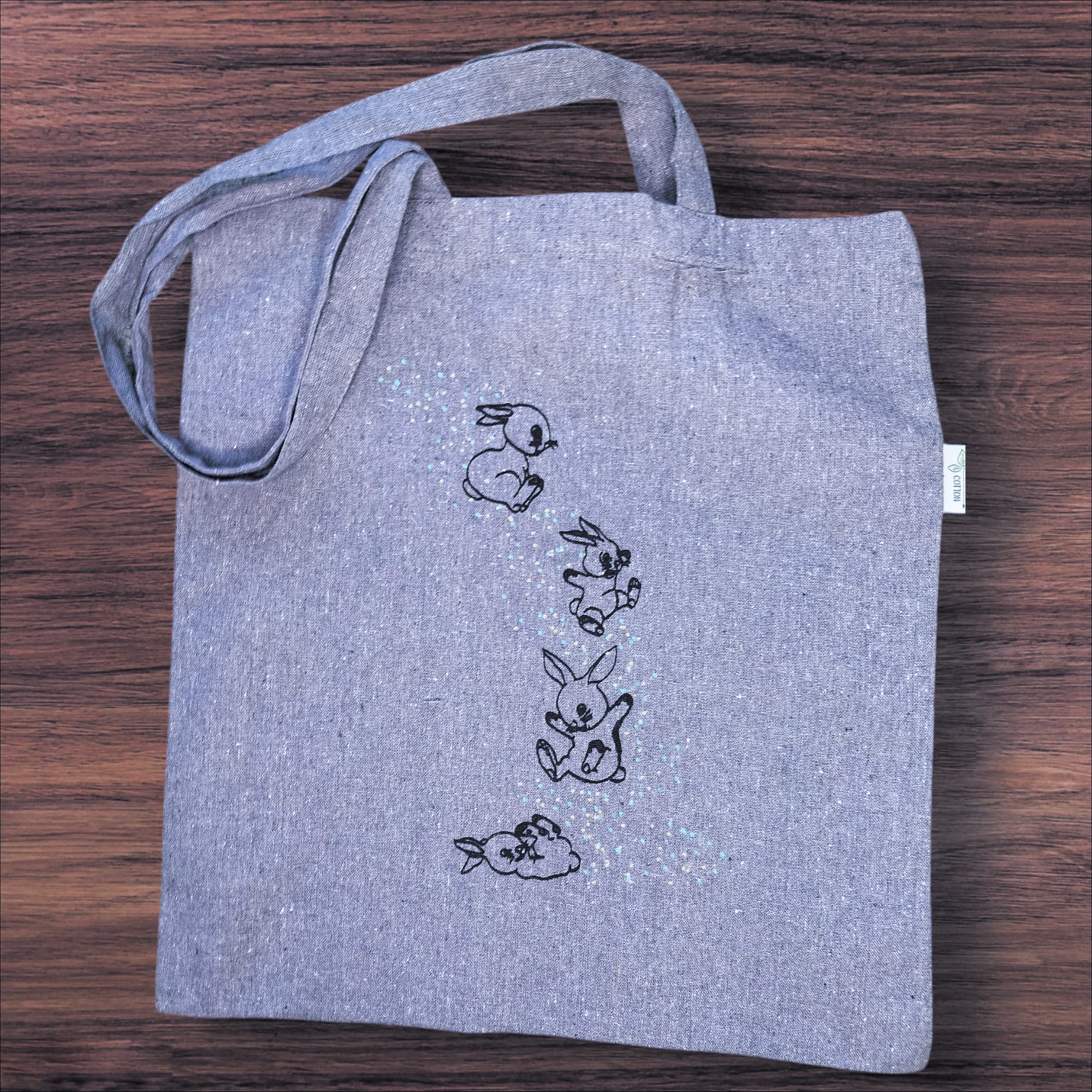 Käsin silkkipainotekniikalla painettu kangaskassi. 100% kierrätettyä puuvillaa eli pinta on ihanan eläväinen, siniharmaa ja kangas on napakka. Väritetty kangastusseilla, värit saattavat vaihdella.