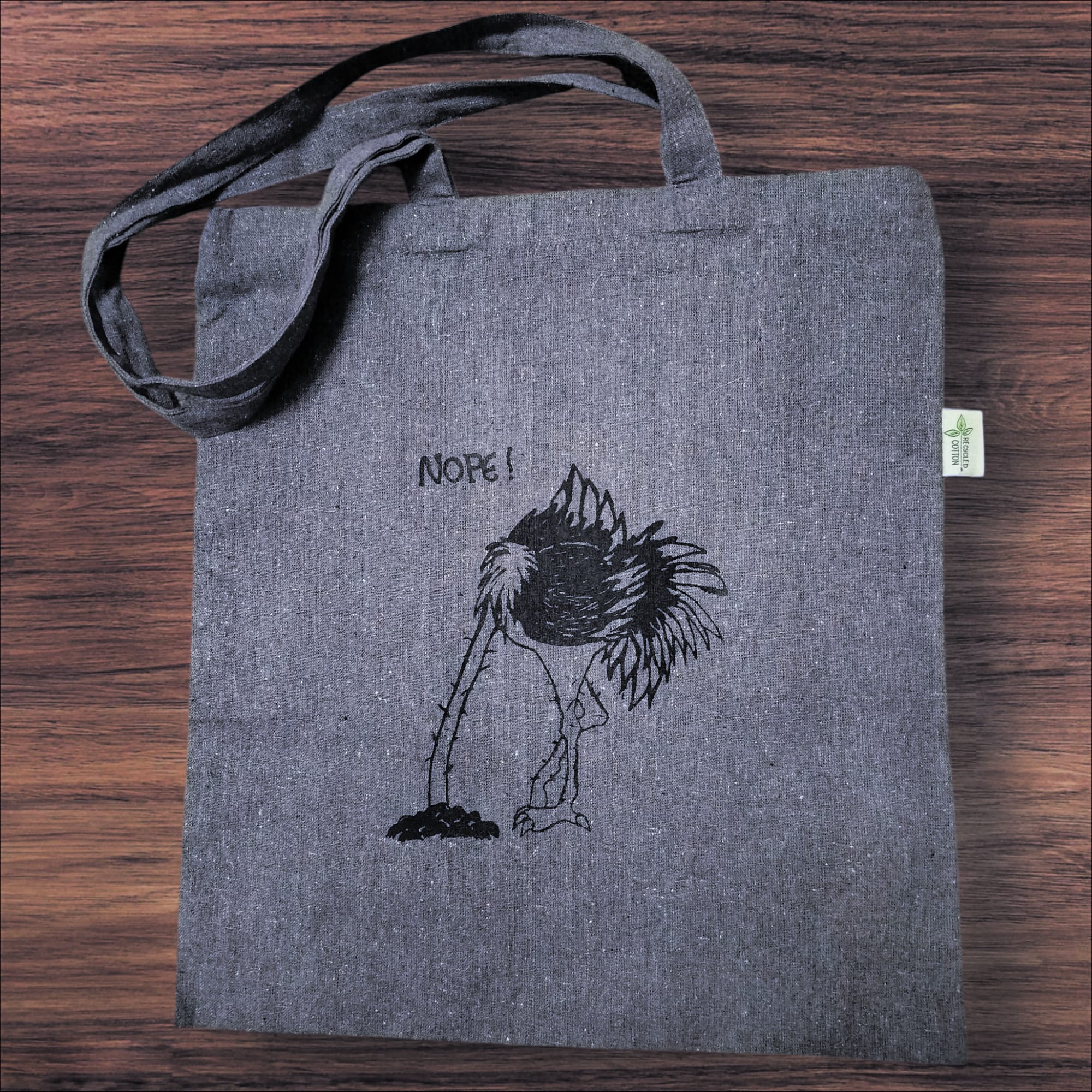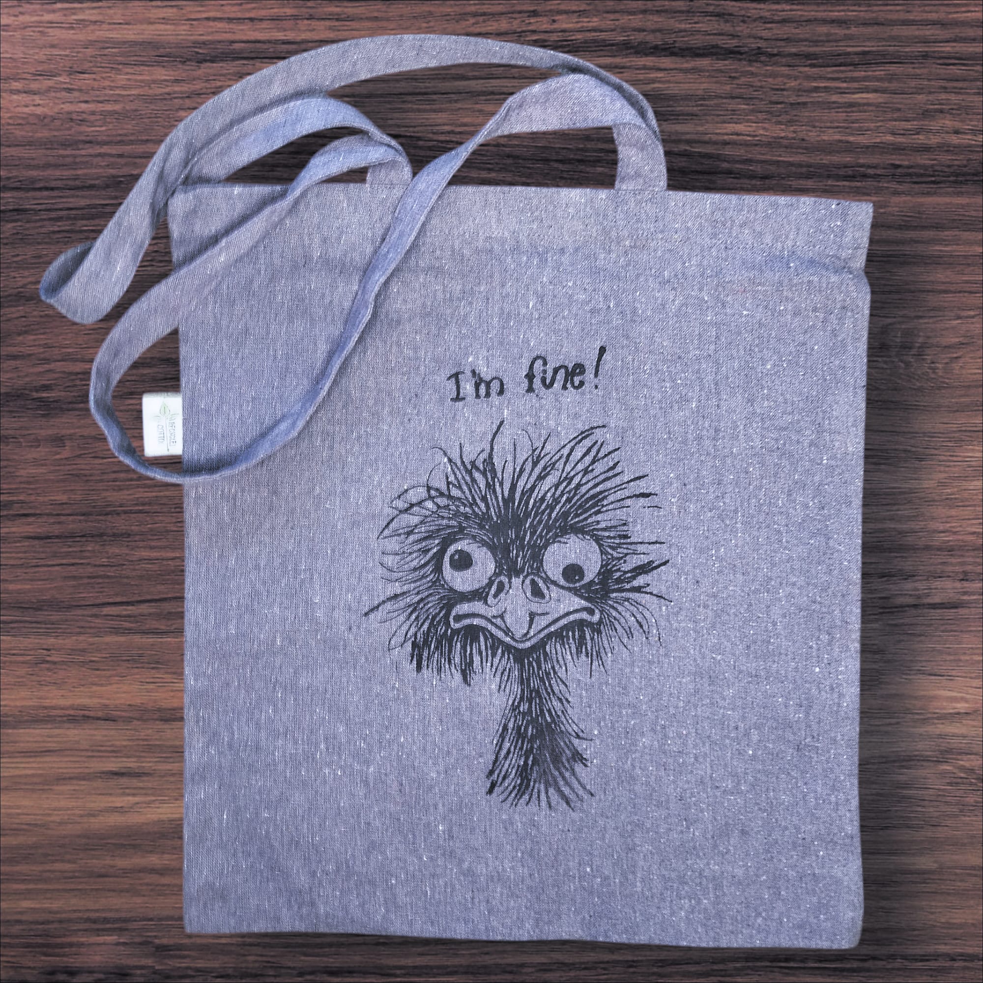 Käsin silkkipainotekniikalla painettu kangaskassi. 100% kierrätettyä puuvillaa eli pinta on ihanan eläväinen, siniharmaa ja kangas on napakka. Väritetty kangastusseilla, värit saattavat vaihdella.